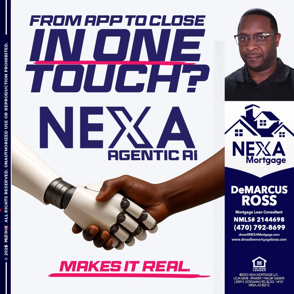 Hi, my name is DeMarcus Ross. I’m a Loan Officer with NEXA Mortgage LLC., offering personalized mortgage solutions, fast customized quotes, great rates and service with integrity.