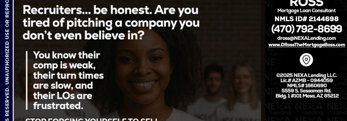 Hi, my name is DeMarcus Ross. I’m a Loan Officer with NEXA Mortgage LLC., offering personalized mortgage solutions, fast customized quotes, great rates and service with integrity.