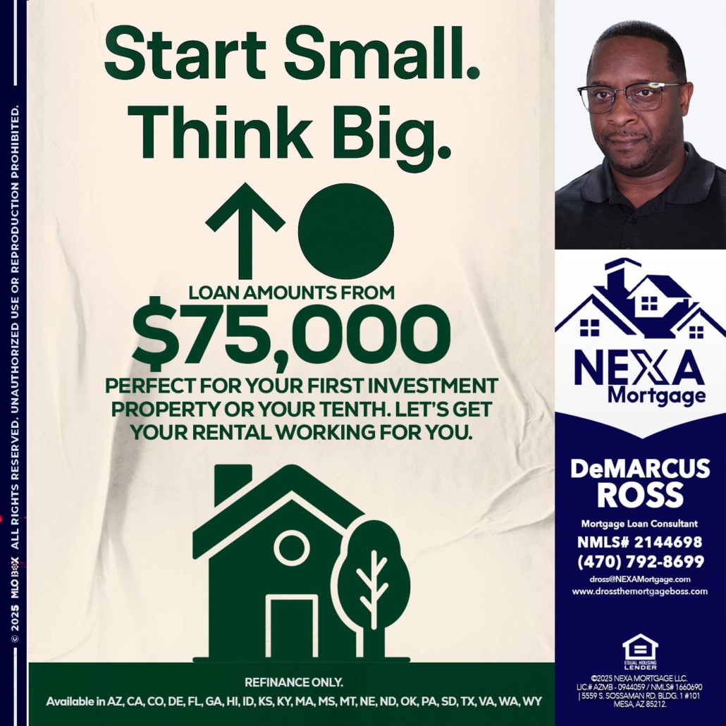 Hi, my name is DeMarcus Ross. I’m a Loan Officer with NEXA Mortgage LLC., offering personalized mortgage solutions, fast customized quotes, great rates and service with integrity.