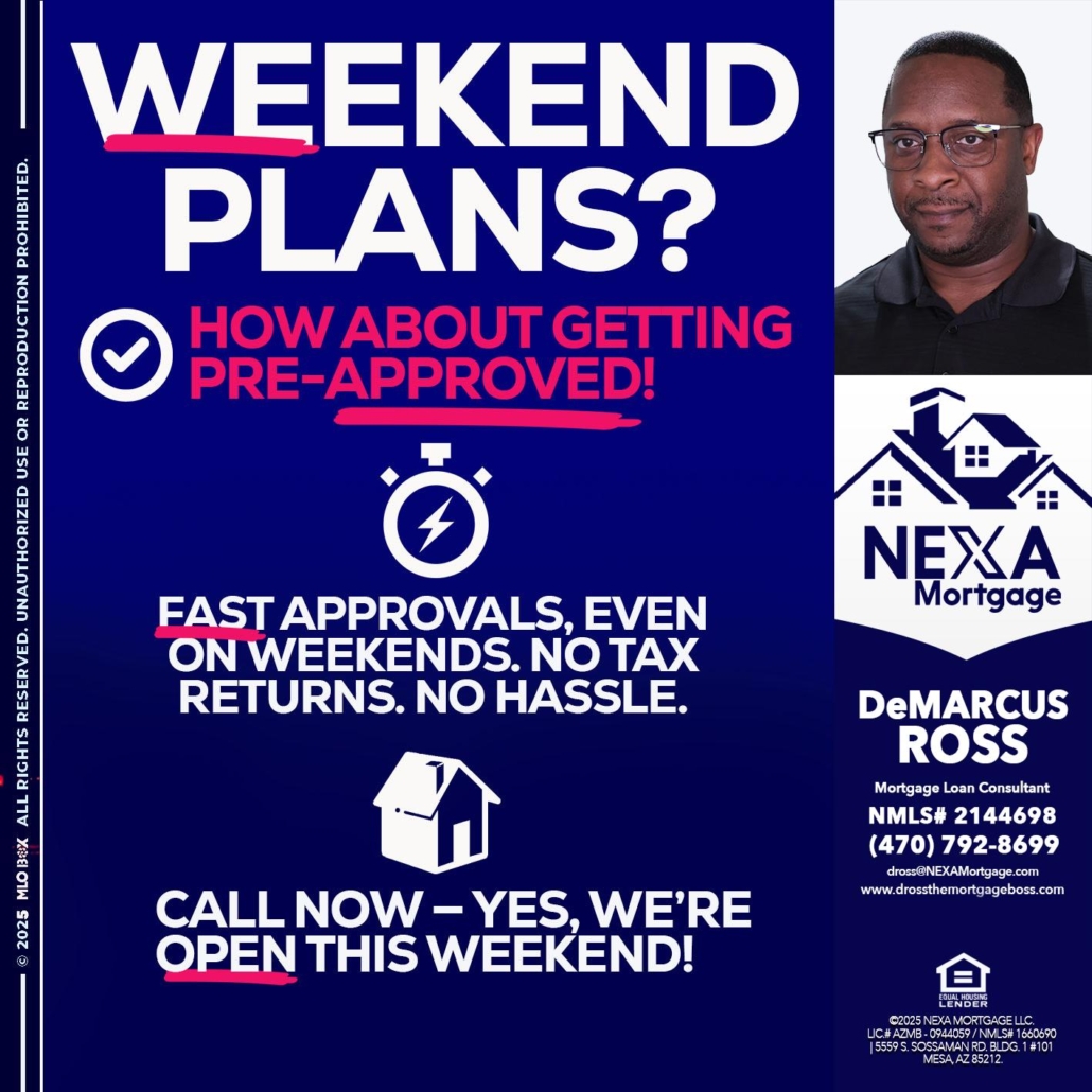 Hi, my name is DeMarcus Ross. I’m a Loan Officer with NEXA Mortgage LLC., offering personalized mortgage solutions, fast customized quotes, great rates and service with integrity.
